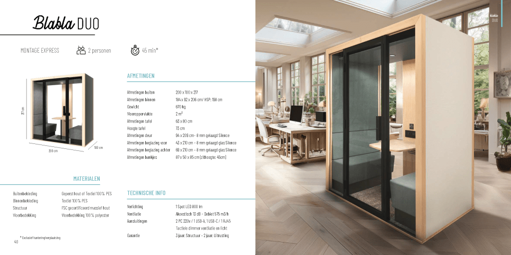 Snelle afstemming, vertrouwelijke gesprekken en videocalls zijn dagelijkse kost in elke organisatie. Toch zijn klassieke vergaderzalen vaak overbezet, te groot of inefficiënt voor korte overlegmomenten. De Blabla Cube Duo biedt een compact en professioneel alternatief: een akoestische vergadercabine voor twee personen, perfect geïntegreerd in open werkomgevingen.